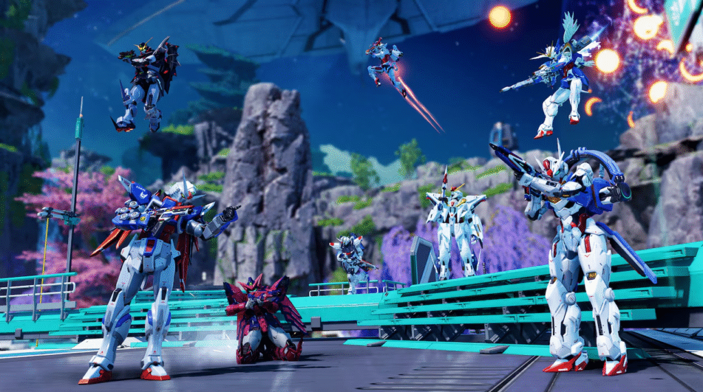 Broken Moon is getting a massive makeover for the duration of the event, transforming into Reborn Broken Moon. We’re talking massive, climbable Wing Gundam statues and destroyed Mobile Suits scattered across the terrain. If you look up, you’ll even see massive battleships duking it out in the skybox. It’s exactly the kind of environmental storytelling that makes a crossover feel like a true event rather than just a shop update.